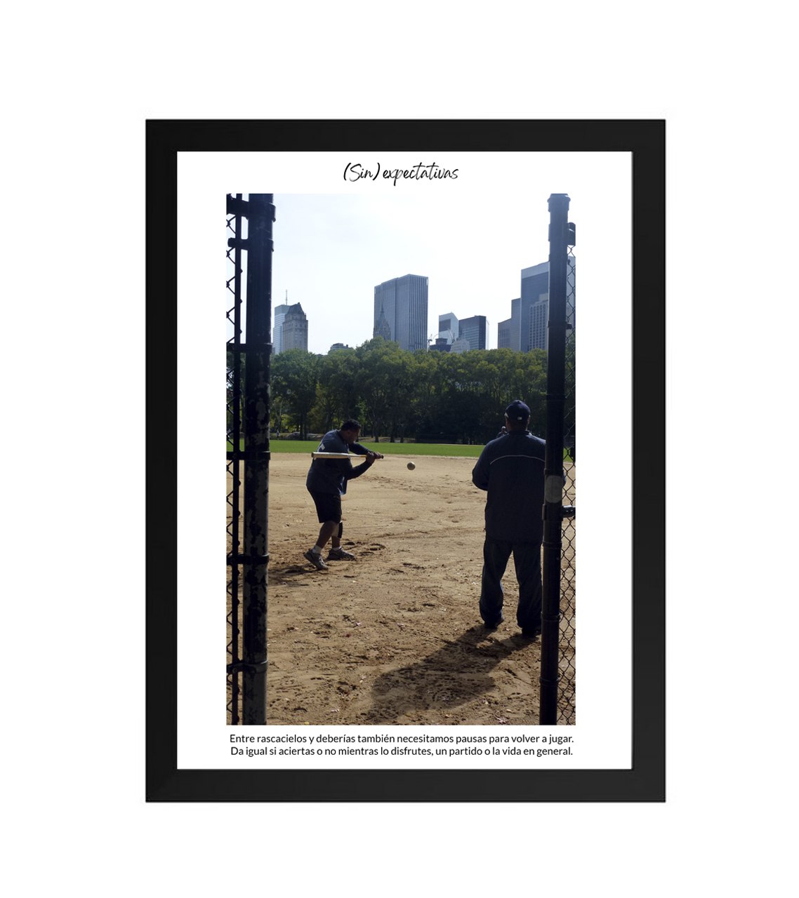 Impresión de un partido de baseball en Central Park en Nueva York (EE.UU.). Esta lámina habla sobre enfocarnos en el proceso y disfrutarlo más allá del resultado y los deberías.
